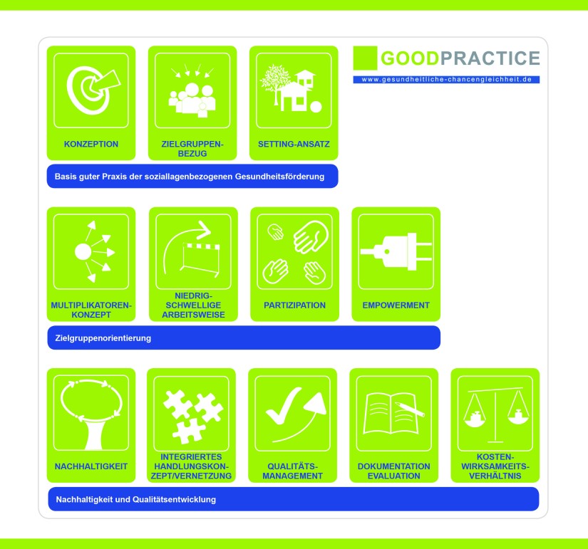 Seit 2004 unterstützen die zwölf Good Practice-Kriterien des bundesweiten Kooperationsverbundes Gesundheitliche Chancengleichheit die Qualitätsentwicklung in der soziallagenbezogenen Gesundheitsförderung. Ein wichtiges Ziel des Kooperationsverbundes ist die Entwicklung der Anbieterqualität im Bereich Gesundheitsförderung mit Hilfe des Good Practice-Ansatzes.