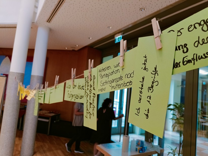 Nach der Mittagspause ging es mit der inhaltlichen Auseinandersetzung und Diskussion weiter. Zuerst begaben sich die Teilnehmenden anhand eines Projektbeispiels aus der Praxis auf eine „Schatzsuche“ nach den Qualitätsmerkmalen. Leitende Fragen waren dabei: Welche Kriterien wurden bei der Umsetzung des Projektes berücksichtig? Wie wurden sie umgesetzt? Auf welcher Entwicklungsstufe befinden sie sich? Wo besteht Weiterentwicklungsbedarf?