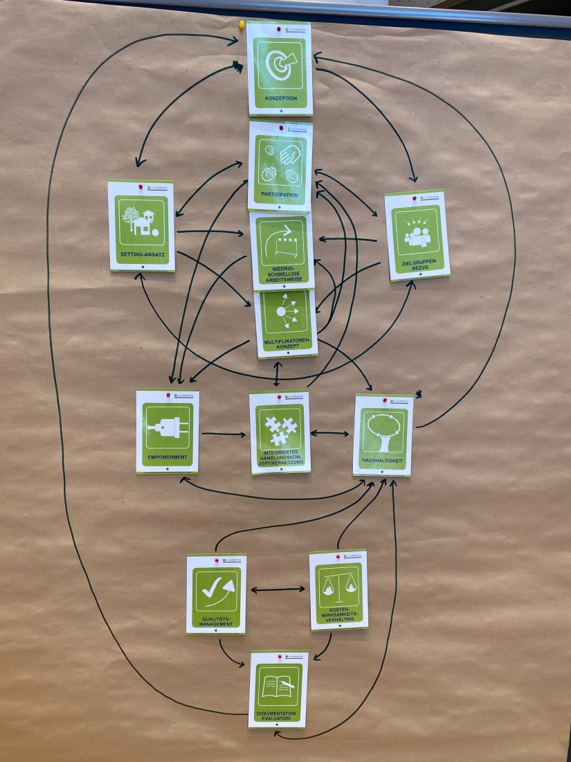 Die Fragestellung lautete: „Worauf sollte man achten, wenn Projekte oder Maßnahmen im Bereich Gesundheitsförderung insbesondere für vulnerable Zielgruppen in Lebenswelten geplant und umgesetzt werden?“ Hierzu wurde den Teilnehmer*innen anhand verschiedener Methoden der Einstieg in die Arbeit mit den 12 Good Practice-Kriterien erleichtert.