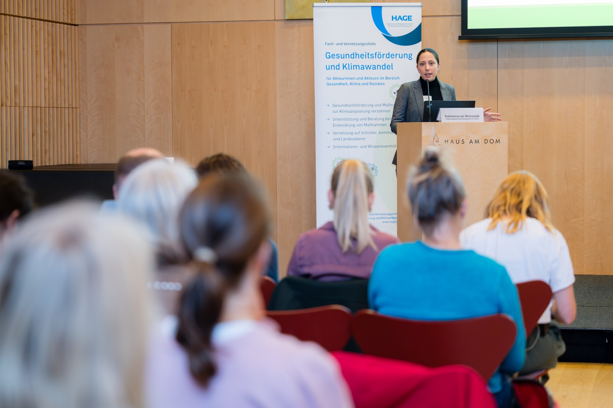 Katharina van Bronswijk, psychologische Psychotherapeutin, beleuchtete den Einfluss des Klimawandels auf die menschliche Gesundheit. Hitze, Umweltkatastrophen, Luftverschmutzung, Vektorerkrankungen oder Mangelversorgung beeinträchtigen dabei nicht nur die körperliche, sondern auch die psychische Gesundheit. Die Folgen des Klimawandels können bestehende psychische Erkrankungen wie Traumafolgestörungen, Demenz oder Depression verstärken. Zugleich entstehen neue Belastungen, etwa Angst (Climate Anxiety), Wut (Eco Anger) oder Trauer (Climate Grief). Um diesen Herausforderungen zu begegnen, bedarf es insbesondere der Stärkung von individueller und kollektiver Resilienz, betonte van Bronswijk.