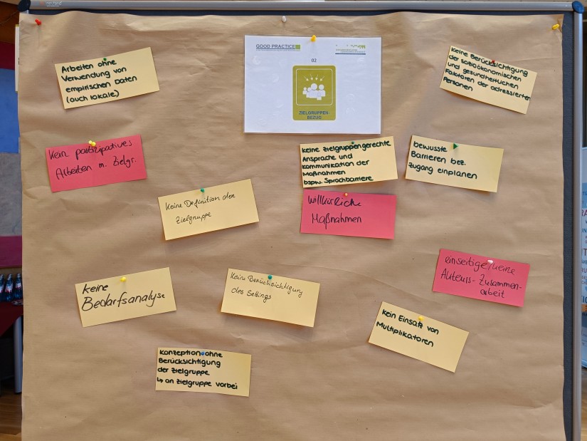 Die Fragestellung lautete: „Worauf sollte man achten, wenn Projekte oder Maßnahmen im Bereich Gesundheitsförderung insbesondere für vulnerable Zielgruppen in Lebenswelten geplant und umgesetzt werden?“ Hierzu wurde den Teilnehmer*innen anhand verschiedener Methoden der Einstieg in die Arbeit mit den 12 Good Practice-Kriterien erleichtert.