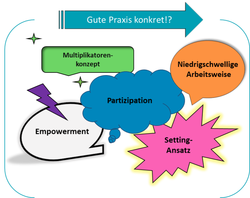 Die Teilnehmerinnen und Teilnehmer hatten während der Präsentation von Frau Nicolai die Möglichkeit, die fünf Good Practice-Kriterien: Setting-Ansatz, Niedrigschwellige Arbeitsweise, Partizipation, Empowerment und Multiplikatoren-Konzeption an Gruppentischen zu diskutieren und die Kriterien auf ihre Umsetzung in die Praxis zu prüfen. Als Anregung dienten erste Reflexionsfragen zu den einzelnen Kriterien.