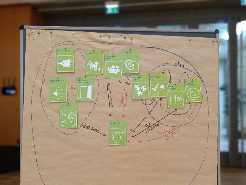 Mit der letzten Methode der Lernwerkstatt "Ein Bild für die Wechselwirkung" wurde die Arbeit mit den Kriterien noch weiter vertieft. Es wurde deutlich, dass die Kriterien in Wechselwirkung stehen und sich bei der Umsetzung gegenseitig bedingen. Dieses Systemspiel muss sowohl bei der Planung als auch bei der Umsetzung von Projekten und Maßnahmen stets im Blick behalten werden.